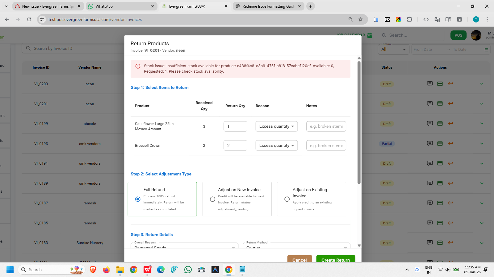 openvendor invoice - when i return with reason excess quantity its shows error