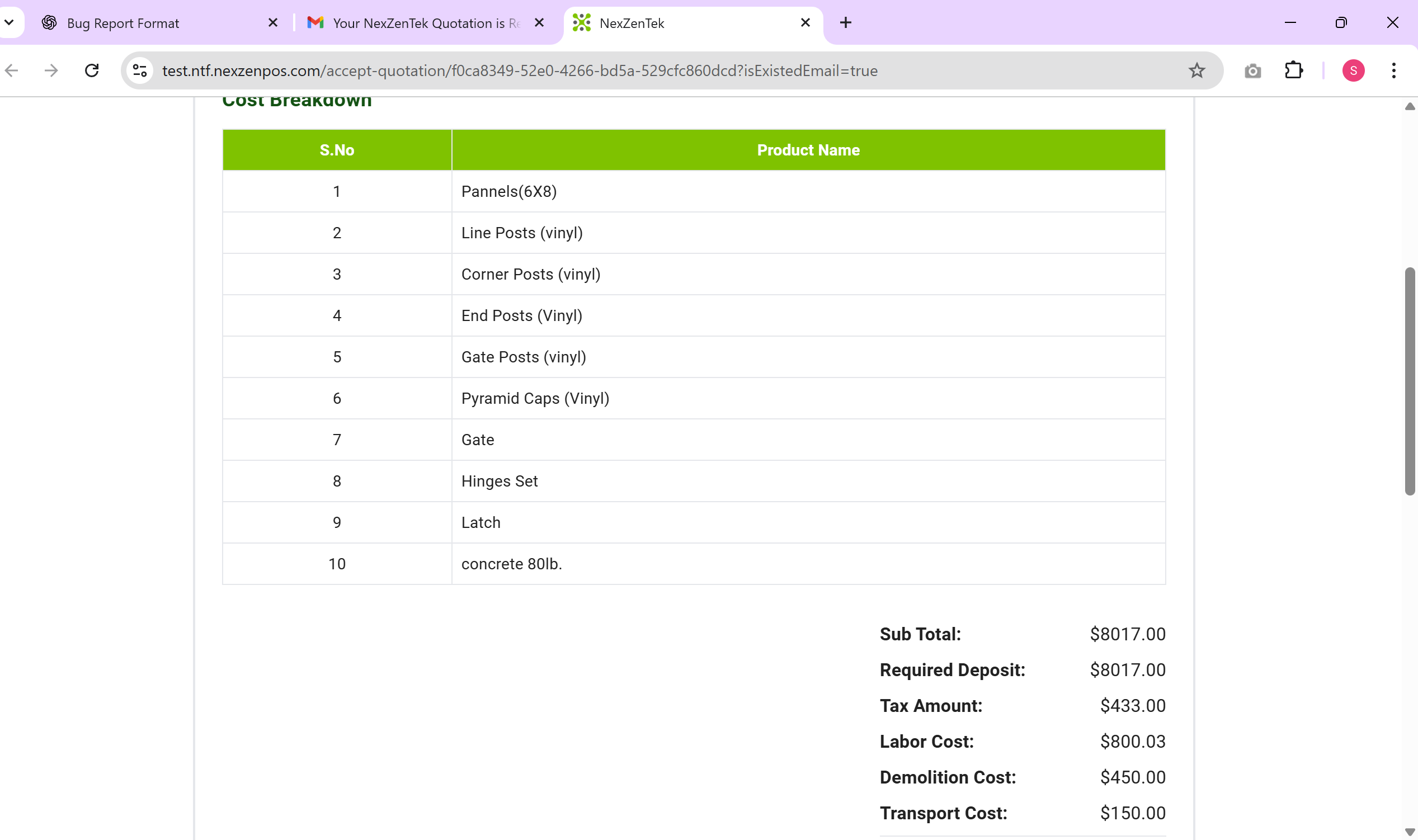 Product quantity and price should be displayed correctly in the cost breakdown.