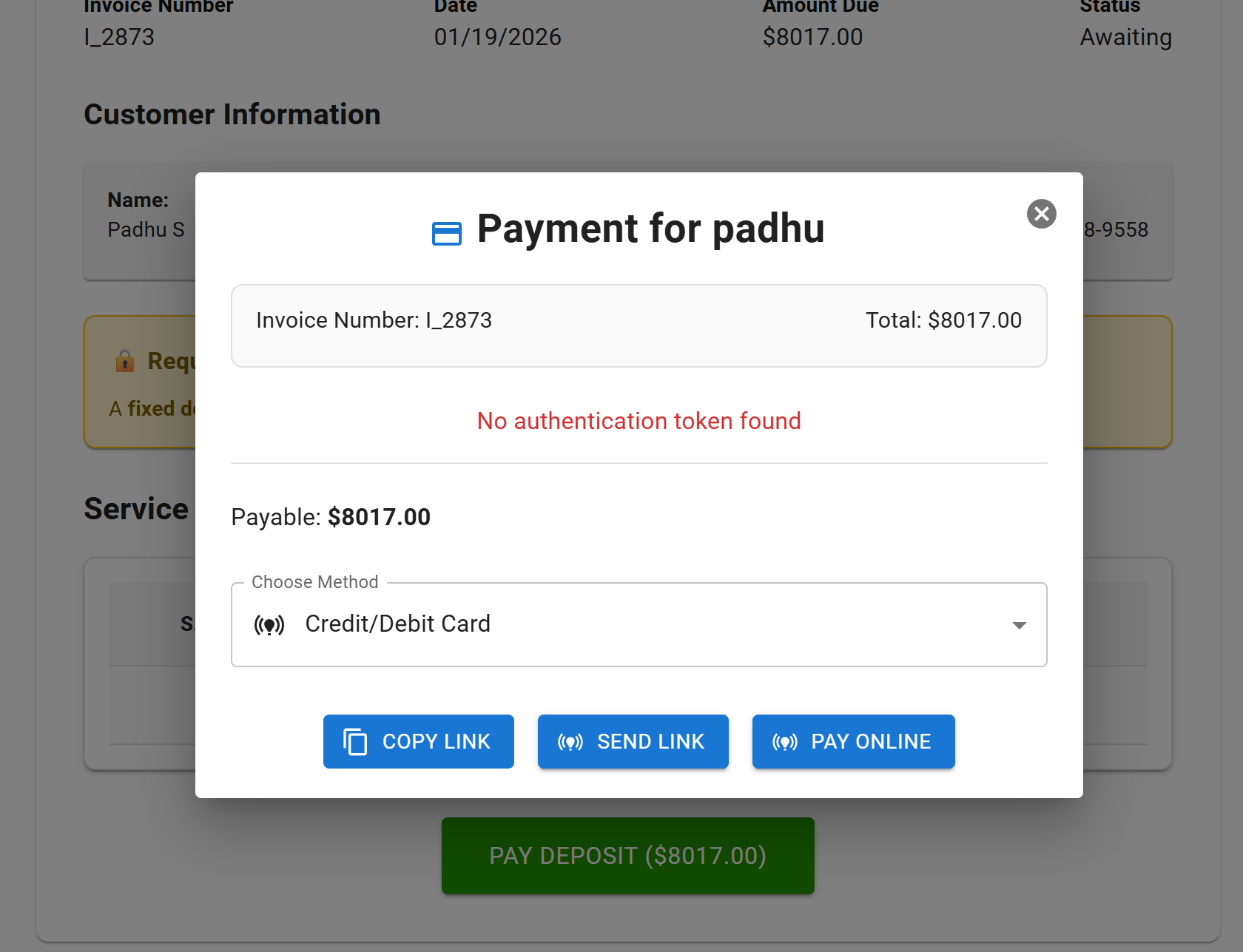 closedError Displayed When Clicking Send Link from Invoice Deposit Page