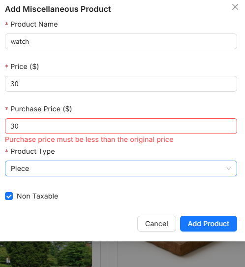 For Miscellaneous Products, the system does not allow entering the same value for Purchase Price and Sale Price.