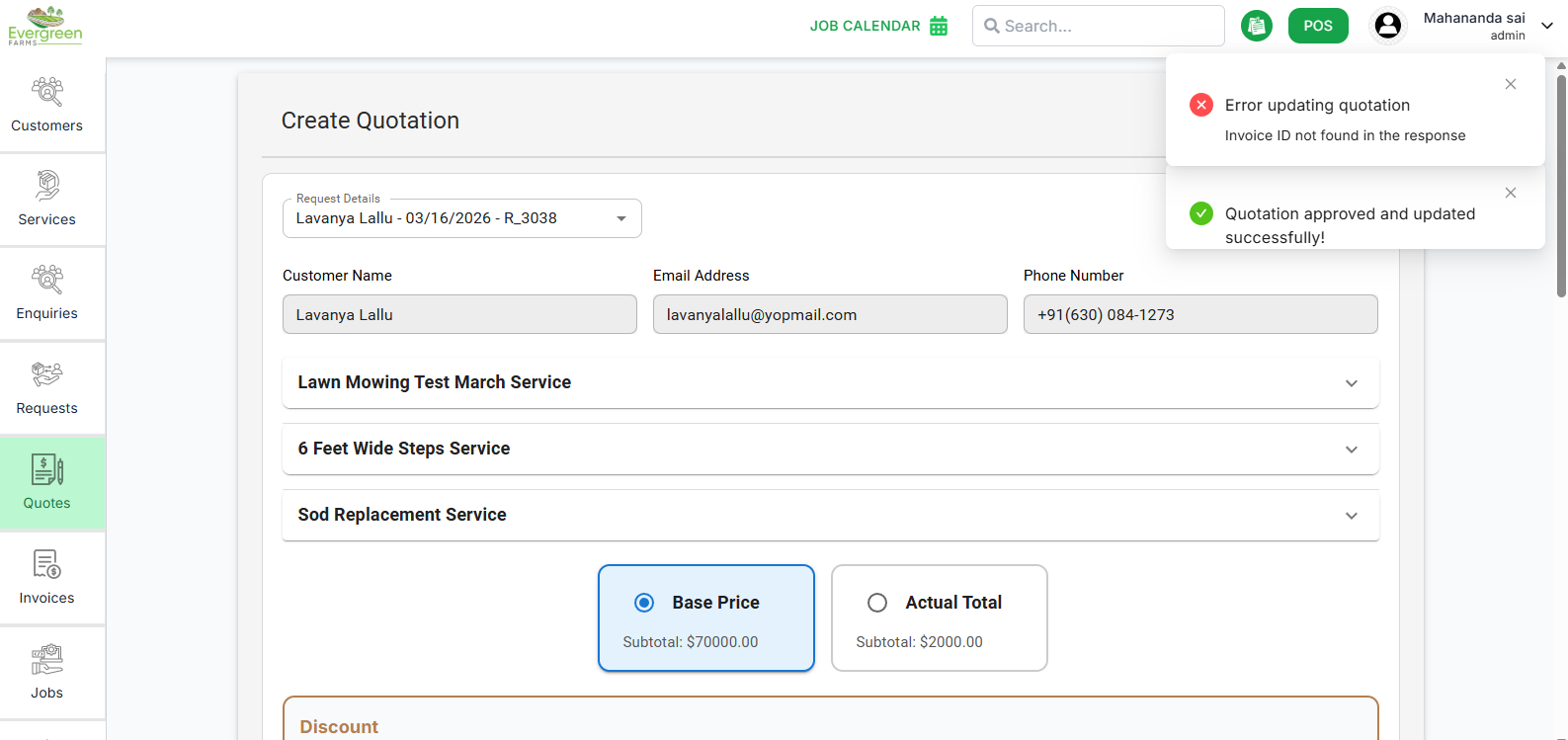 qoute approved - after creating qoutation i click on approved by admin its showing this error